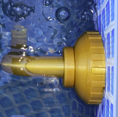 Intex Pool Düse war ursprünglich zum Zentrum des Pools. Damit Chemikalien, wie Chlor, pH-Senker usw. besser verteilt wird, aber auch der Dreck sich besser in der Mitte sammelt (kein Skimmer vorhanden) habe ich diesen Düsenadapter gemacht. Die Auslassdüse ist neu über ein abgewinkeltes Rohr tiefer in den Pool und auch parallel zur Poolwand abgelenkt. Dadurch ergibt sich ein kleiner Wirbeleffekt. Die eigene Düse hatte genau das gleiche Gewinde wie die Originale und konnte somit jederzeit ausgewechselt werden. Das Auslassrohr wurde mit dem zweiten, kleineren Ring über eine Rasterung nochmals angeschraubt und konnte somit im Winkel eingestellt werden.