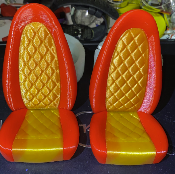 Mehrfarbiger Druck für RC-Autositze. Ich habe die ursprüngliche 3d-Datei angepasst (MeshMixer) und damit in einem Druck die Sitzfläche golden und die Außenränder Rot gemacht. Mein Drucker kann bis zu 5 Farben oder 5 unterschiedliche Materialien (welche natürlich gegenseitig haften) gleichzeitig Drucken.